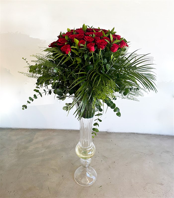 50 adet kırmızı özel ekvator gülünden, royal ayaklı cam vazoda aranjman...