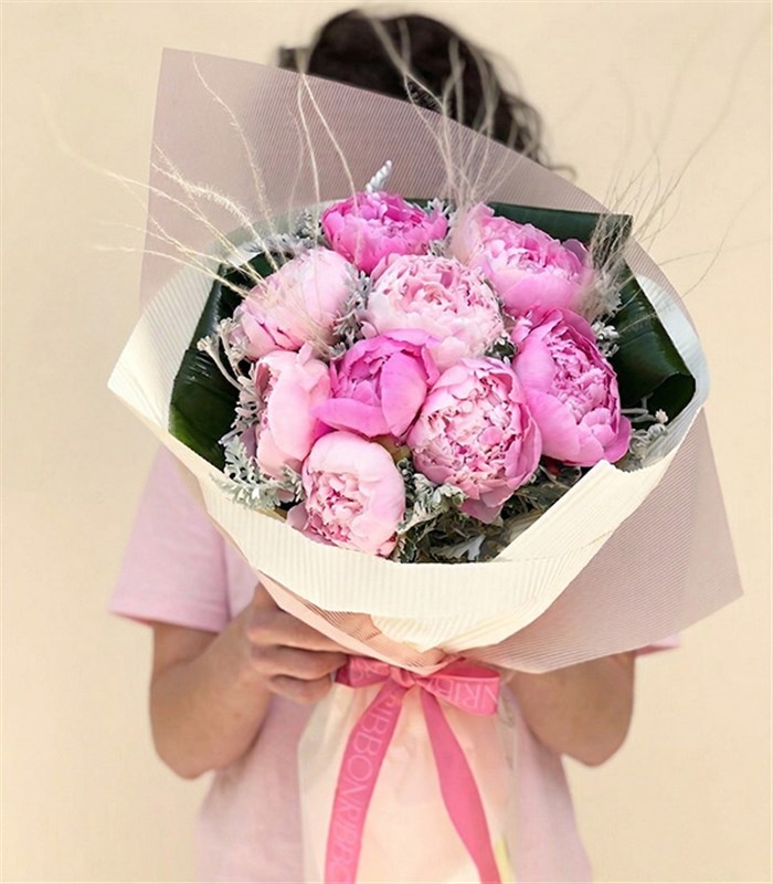 Agnes Pembe Şakayık Buketimizin içinde 9 adet pembe şakayık, lavanta, asperisya ve krem rengi tüyler bulunmaktadır.