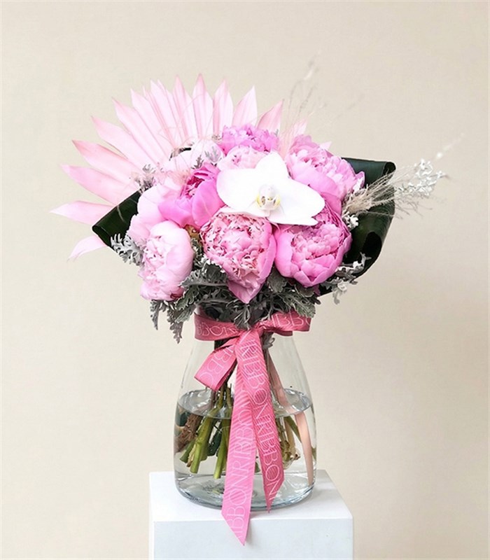 Cam silindir vazoda 9 adet toz pembe şakayık, 1 adet beyaz orkide, tüyler ve yelpaze ile dizayn edilmiştir.