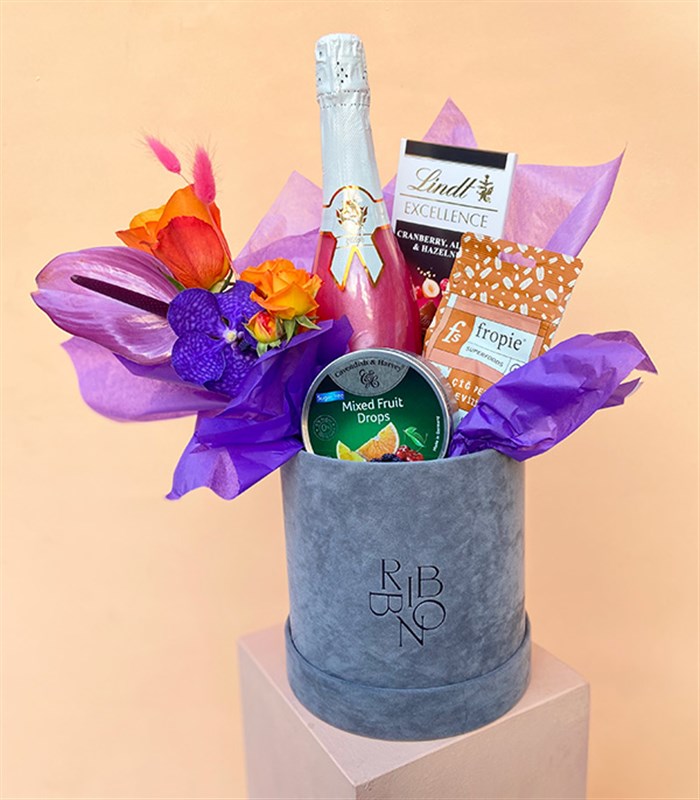 Alkolsüz şampanya, Lindt Excellence Cranberry, Almond&Hazelnut Dark Chocolate, Fropie Pekan Cevizi, Cavendish & Harvey Mixed Fruit Drops, 2 adet turuncu gül, 1 adet turuncu vanda orkide ve kuru çiçekler yer almaktadır.