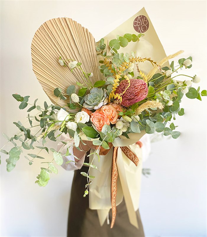 doğal renk banksia, doğal ve yeşil tonlarda çeşitli kuru çiçekler, doğal yelpaze, mavi dikenler, okaliptuslar, beyaz lisiantuslar, 3 adet somon gül, bir adet sukulent bulunmaktadır.