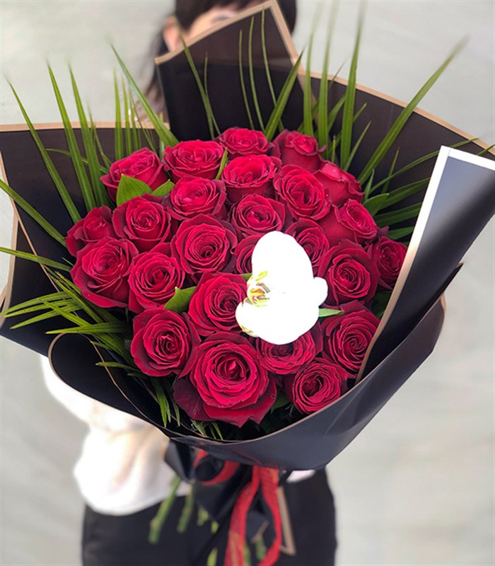 25 adet ekvator kırmızı gül, etrafında fenix yaprakları ve arasında beyaz orkide bulunmaktadır.