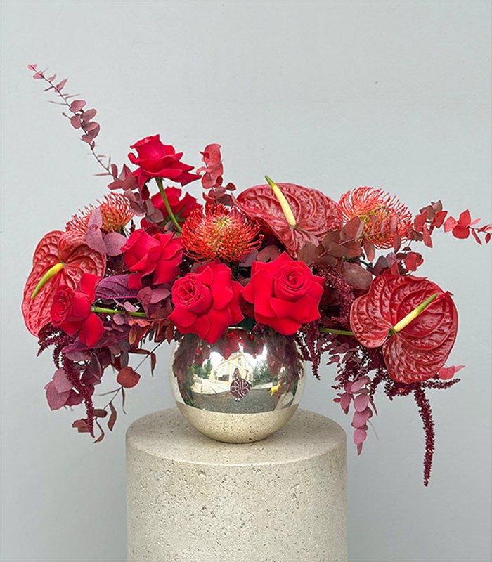 Gümüş görünümlü cam vazoda turuncu lucaslar, bordo antoryumlar, kırmızı güller, bordo okaliptuslar ile dizayn edildi.