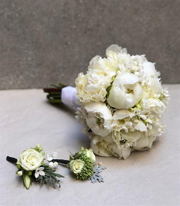 Annemarie 11 Beyaz Şakayık Gelin Buketi Damat Sadıç Yaka Çiçeği Seti