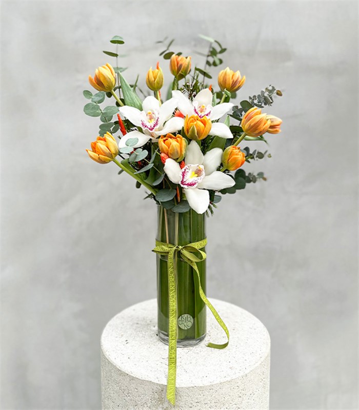 Silindir cam vazo içinde 10 adet ithal turuncu lale, 3 adet cymbidium orkide, okaliptus ve yeşillikler bulunmaktadır.