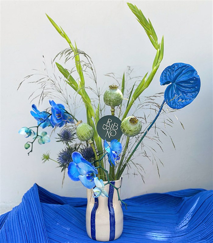 Mavi orkideler, haşhaşlar, beyaz glayörler, mavi boyanmış antoryum, erginyum ve mevsime özel yeşillikler ile dizayn edildi.