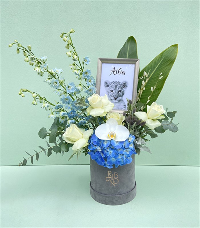 Bebek ismine özel hazırlanmış silver aslan çerçeveli, 4 adet beyaz ekvator gülleri, 3 adet delfinyum,1 adet beyaz orkide, 1 adet mavi ortanca, lavanta yaprağı, pelin, okaliptus yaprakları, gri tüyler ile dizayn edilmiş Beyaz Mavi Deluxe kutuda yeni bebek tebriği aranjmanı...