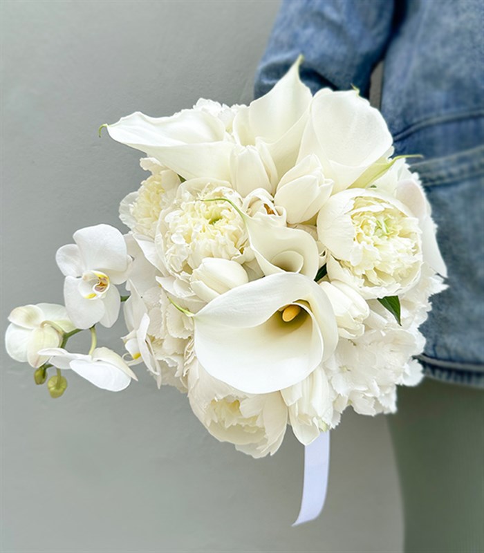 Benedetta 2 Beyaz Ortanca 5 Beyaz Şakayık 5 Gala 5 Lale Gelin Buketi