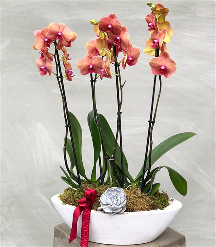 Beyaz oval beton saksıda 4 dal orkide narçiçeği phalanopsis ve 1 adet succulent bulunmaktadır.
