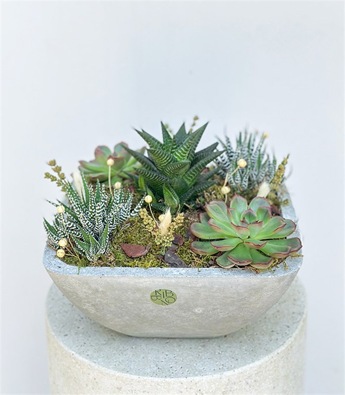 5 adet farklı sukulent sistemi ile hazırlanmış şık bir sukulent aranjmanı.
