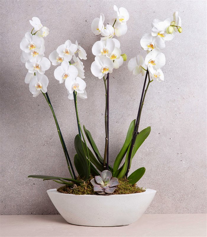 Ürün içeriğimizde beyaz renkte taş oval saksıda 4 dal beyaz saksı orkide, 1 adet echeveria succulent bulunmaktadır.