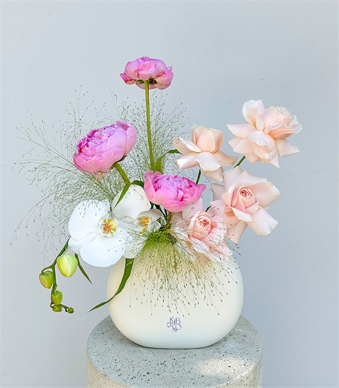 Krem seramik vazoda pembe şakayıklar, pembe ekvator gülleri, beyaz orkide ve mevsim yeşillikleri ile dizayn edildi.