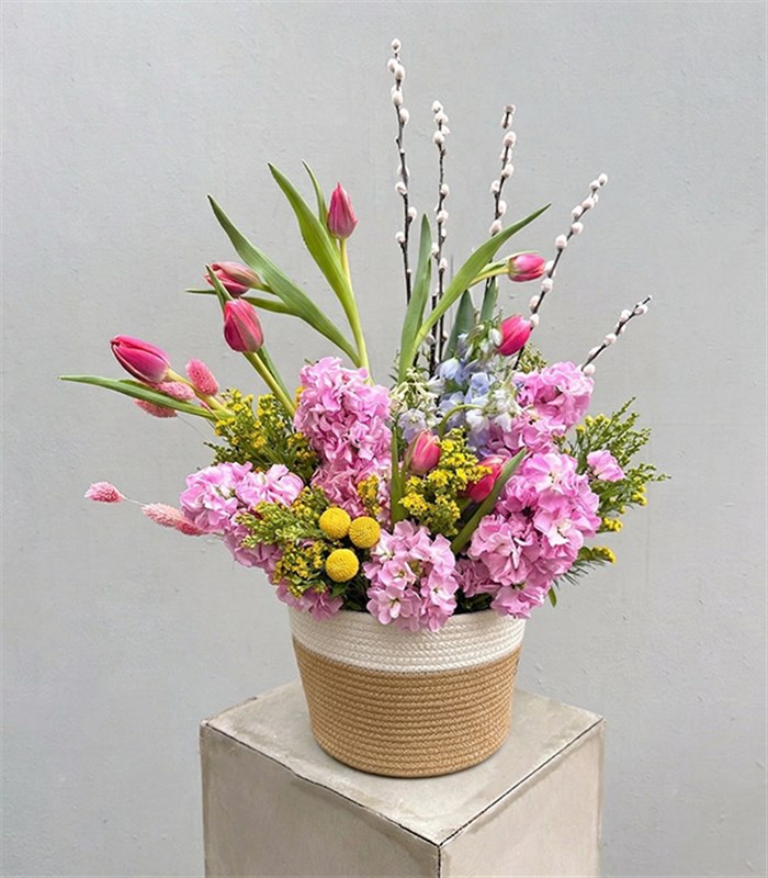 Hasır detaylı yuvarlak lüks sepette, mis kokulu pembe şebboylar, mavi delfinyum, craspedialar, gümüş dalları ve pembe hollanda laleleri ile dizayn edildi.