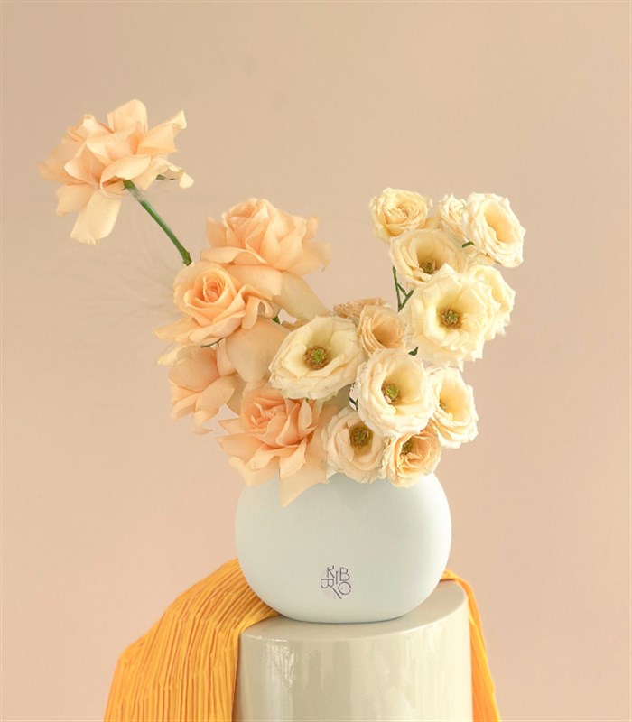 Kayısı güller ve somon çardak güller, krem tüyler ile krem rengi seramik vazoda dizayn edildi.