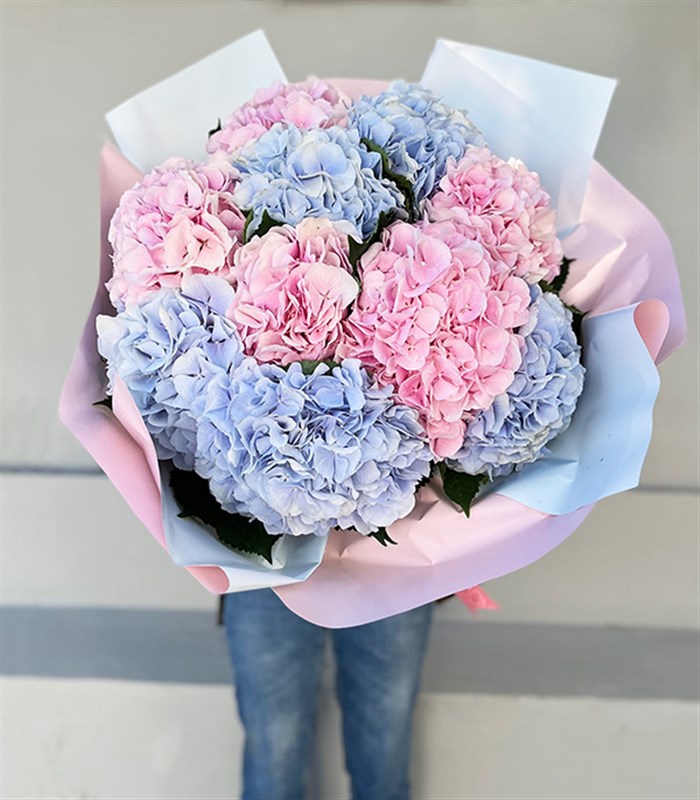 Pembe ve mavi ortancalardan bulut gibi bir buket...