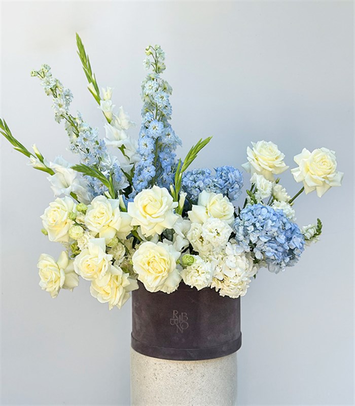 Beyaz ve mavi ortancalar, beyaz güller, mavi delfinyum, beyaz lisyantus, aslanağzı ve glayöller ile hazırlanmıştır.