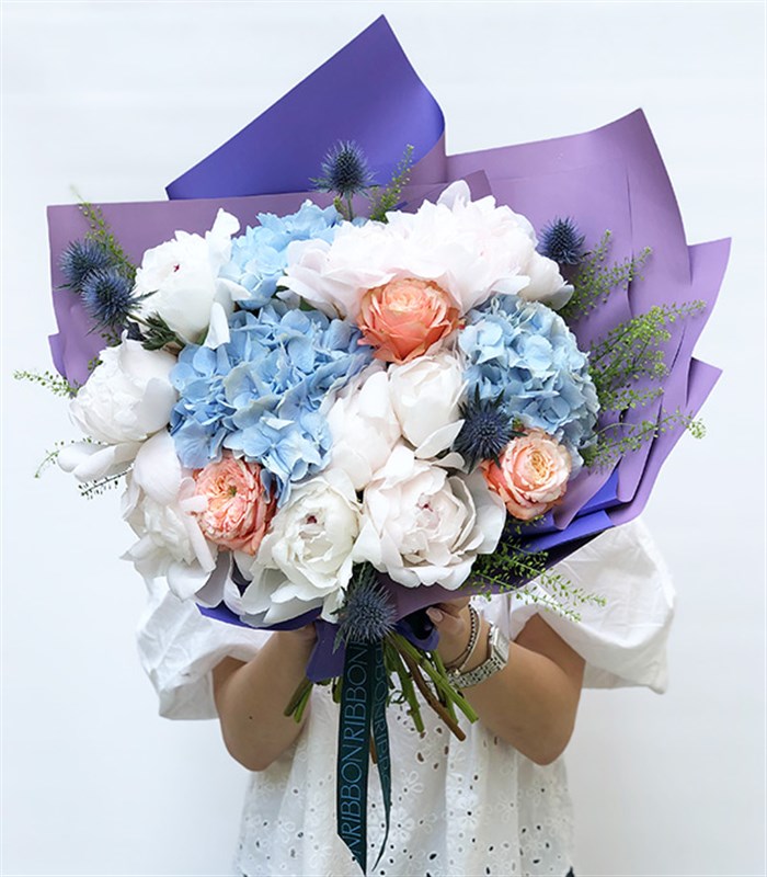 Charley Deluxe Mavi Ortanca Şakayık Buketimizin içinde 3 adet mavi ortanca, 10 adet beyaz şakayık, 3 adet somon gül, 5 adet mavi diken ve traspi yeşillikleri bulunmaktadır.
