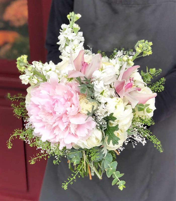 Mavsimin en güzel ithal beyaz gülleri, zarif beyaz erengüller, mis kokulu pembe şakayık, pembe sipidyum orkideler, beyaz şebboylar ve mevsim yeşilliklerinden oluşan gelin buketimiz...