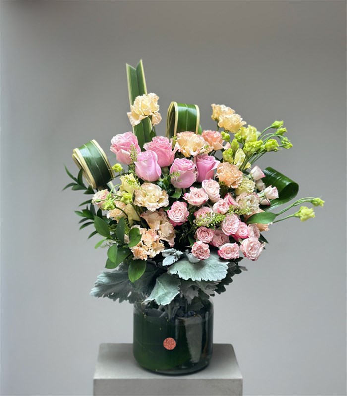 Cam vazo içerisinde pembe çardak güller, somon lisyantuslar, pembe ekvator gülleri, okaliptus yaprakları, kılıç yeşillikleri ve traspi yeşillikleri ile hazırlanmıştır.