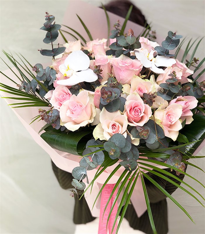 Buketimizin içerisinde, 20 adet ekvator ithal pembe gül, 2 adet beyaz orkide, mis kokulu okaliptus ve etrafında fenix yaprakları ile yeşillikler bulunmaktadır.