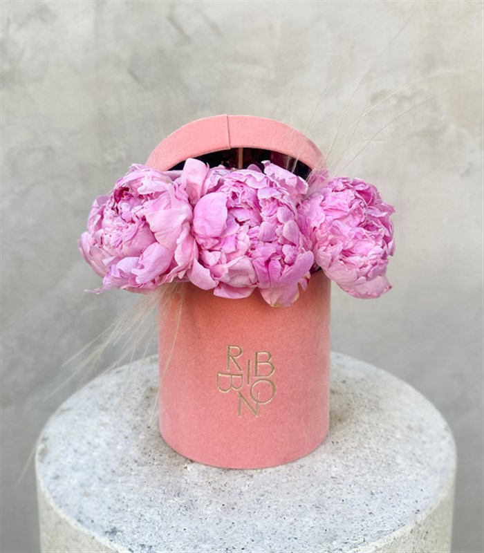 Mini kadife kutumuzda 3 adet pembe şakayık ve tüyler bulunmaktadır.