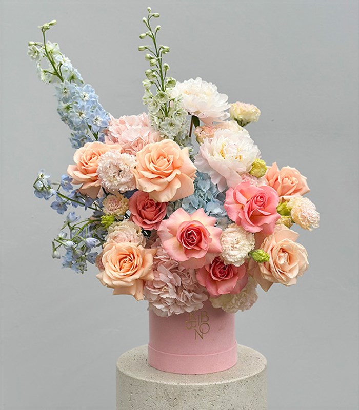Clarte Deluxe Kutuda Gül Delfinyum Pudra Şakayıklı Bahar Aranjmanı