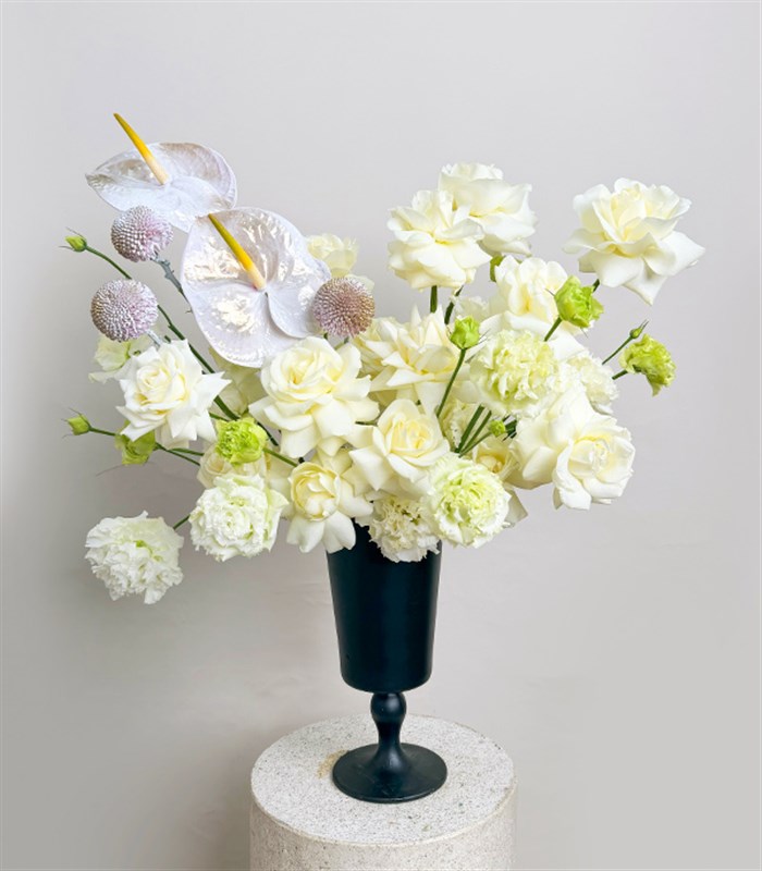 Siyah Cam ayaklı vazonun içerisinde beyaz güller, lisyantuslar, gold detaylı antoryumlar ve üst anastasyalar bulunmaktadır.