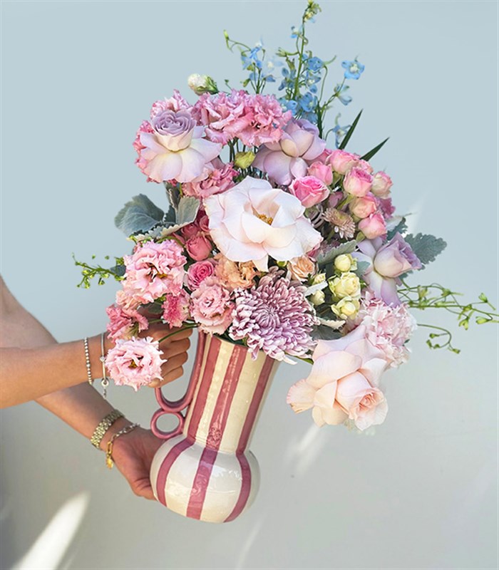Hande Ceramic Studio kurucusu "Hande Şahinkaya" tarafından sadece RIBBON'a özel dizayn edilen tamamen el yapımı "Pembe El İşi Seramik Sürahi Vazo" içerisinde hazırladığımız, benzersiz vazosu ile kalıcı hale gelebilen fresh bir yaz aranjmanı...