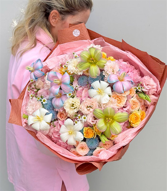 Pembe ortancalar, lisyantuslar, yeşil pembe laleler, unicorn ve beyaz laleler, papatyalar, mavi krizantemler ve somon çardak güller ile dizayn edilmiş çok özel bir buket.