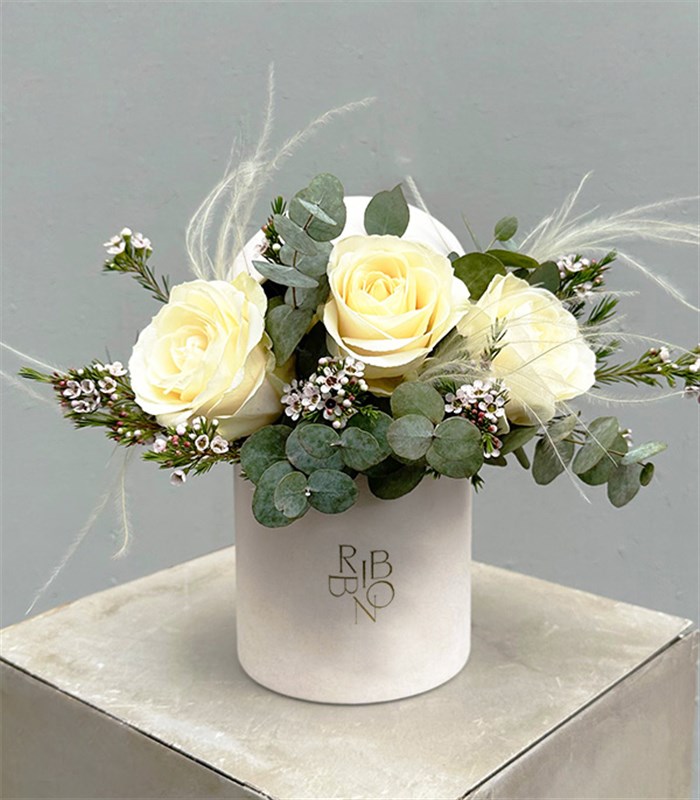 Ribbon özel tasarımı krem renk mini kadife kutu içinde 3 adet beyaz gül, wax yeşilliği ve krem lüks tüyler bulunmaktadır.
