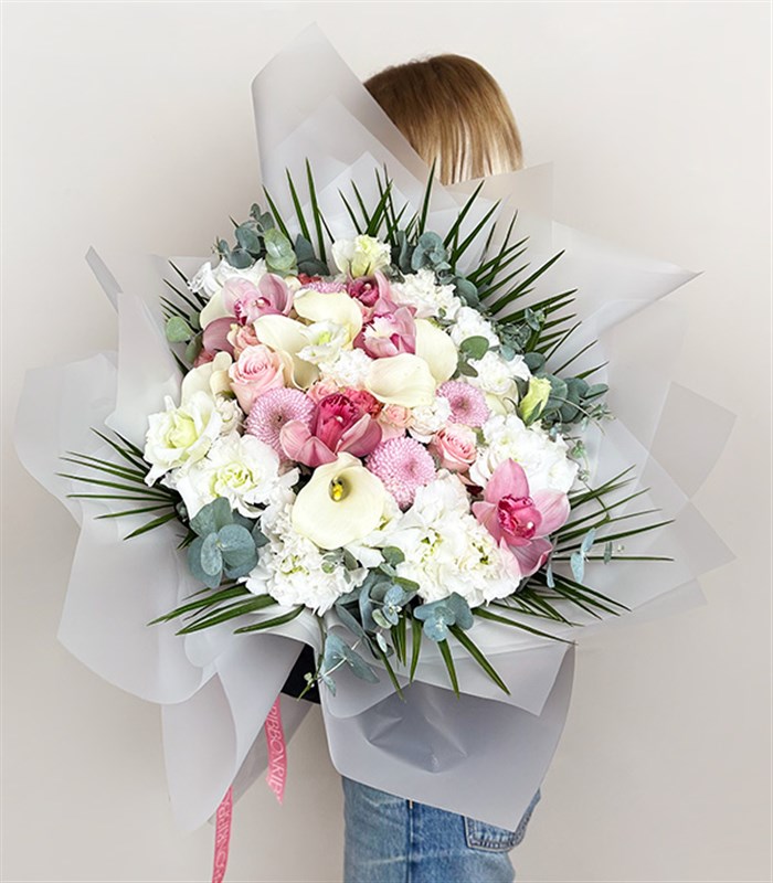 İçerisinde pembe ekvator gülleri, beyaz galalar, orkideler, anastasyalar, mevsim kır çiçekleri, lisiantuslar, fenix yaprakları ve okaliptus yaprakları bulunmaktadır.