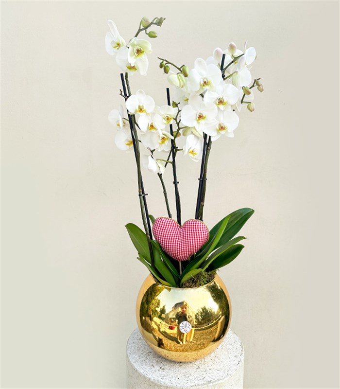 Deluxe Gold Vazoda Kalp Figürlü 4 Dal Beyaz Orkide
