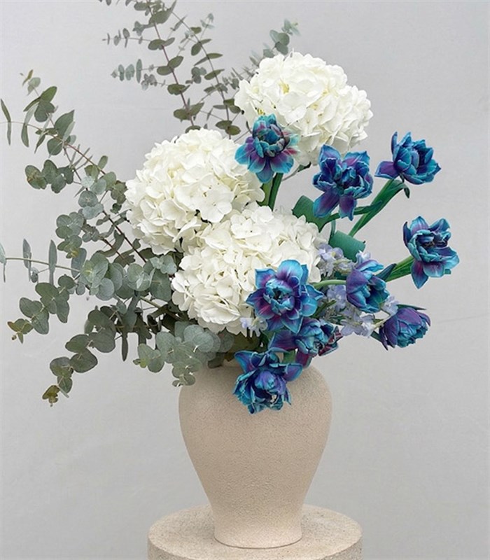 Galaksi laleler, beyaz ortanca, delfinyum ve okaliptus ile hazırlanmıştır.