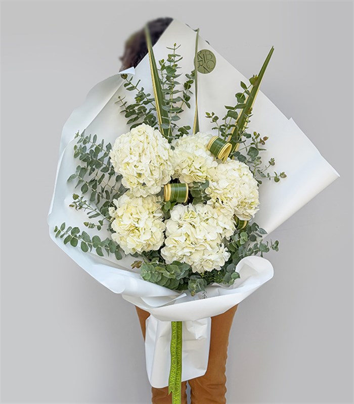 Buketimizin içerisinde 6 adet beyaz ortanca, yeşil yapraklar bulunmaktadır.