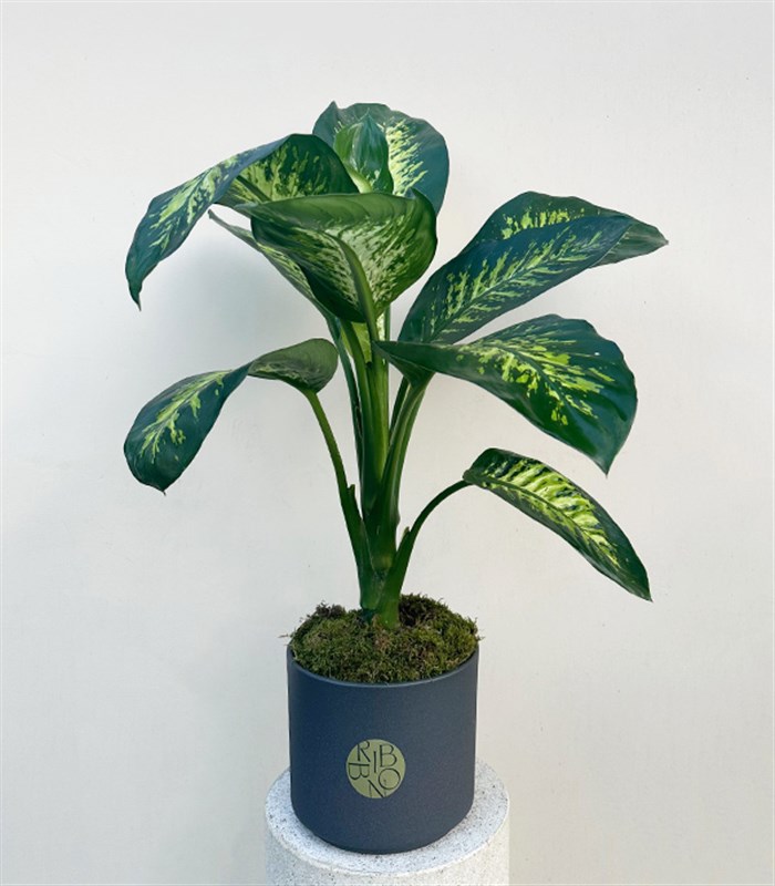 Gri deluxe seramik saksı içerisinde Difenbahya Bitkisi.