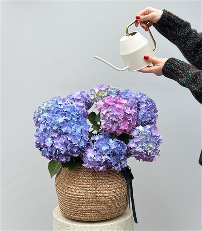 Doğal jüt sepet içerisinde ekili saksılı mavi ortanca çiçeği.