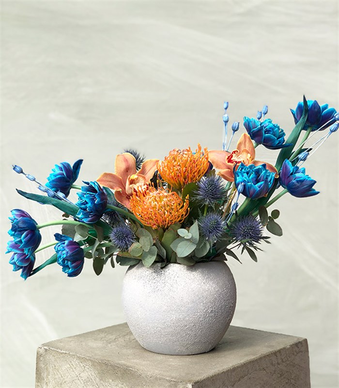 Beton görünümlü Taş Vazo'daki aranjmanımız 10 adet özel galaksi Lale, 2 adet turuncu Lucas, 2 adet turuncu Cymbidium Orkide, 7 adet Mavi Diken, Okaliptus yaprakları ve kuru çiçeklerle dizayn edildi.