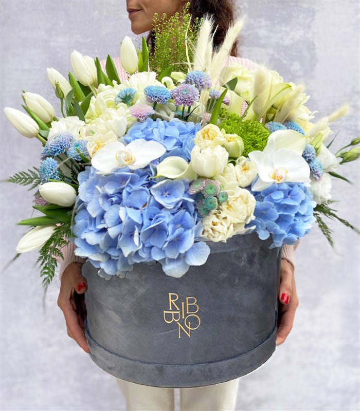 Ribbon Flowers füme Grand Kutu içerisinde, beyaz laleler ve mavi ortancalar ile farklı bir kutuda çiçek aranjman...