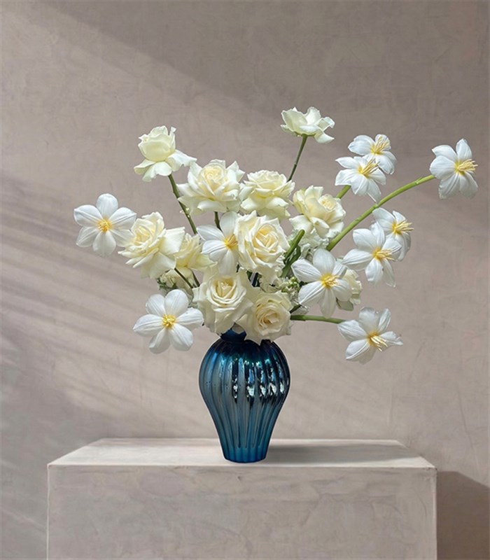 Elysienne Deluxe Hologram Mavi Vazoda Beyaz Gül Beyaz Lale Aranjmanı