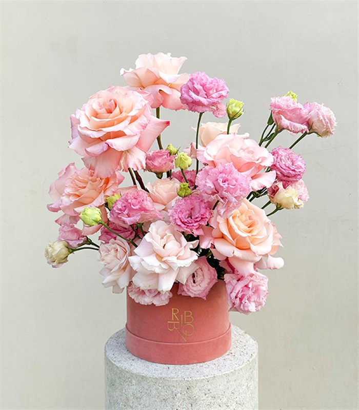 Embrace Kadife Kutuda Gül Pembe Çiçekler Aranjmanı; Pembe ekvator gülleri ve lisyantuslar ile hazırlanmış gösterişli bir tasarım.