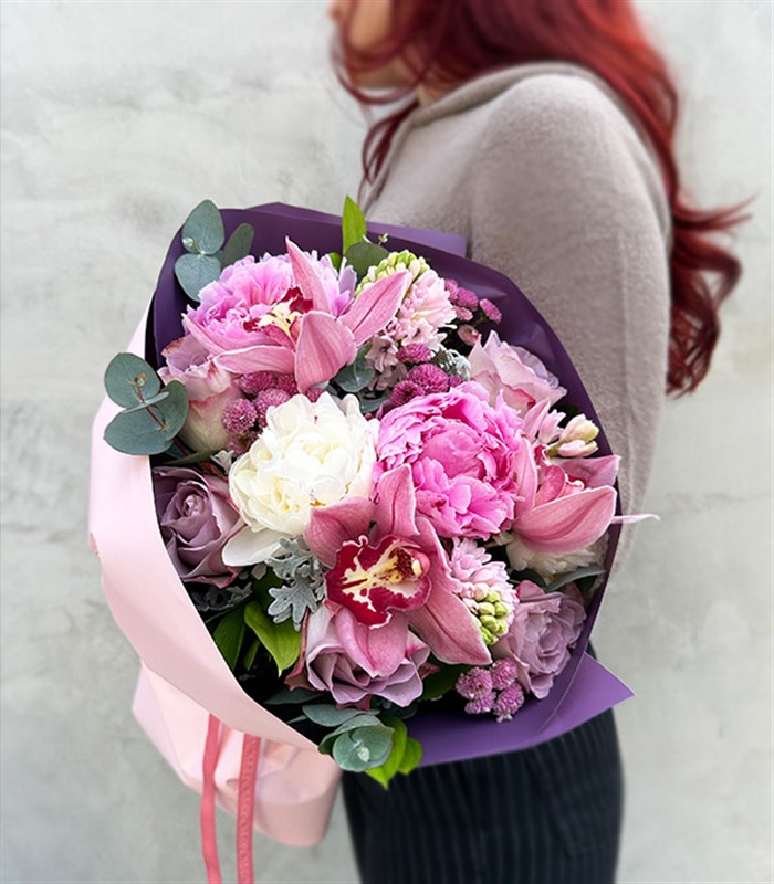 Emilia Lila Gül Sümbül Beyaz Pembe Şakayık Sevgililer Günü Buketi içerisinde pembe şakayıklar, pembe sümbüller ve lila güllerle ile dizayn edildi.