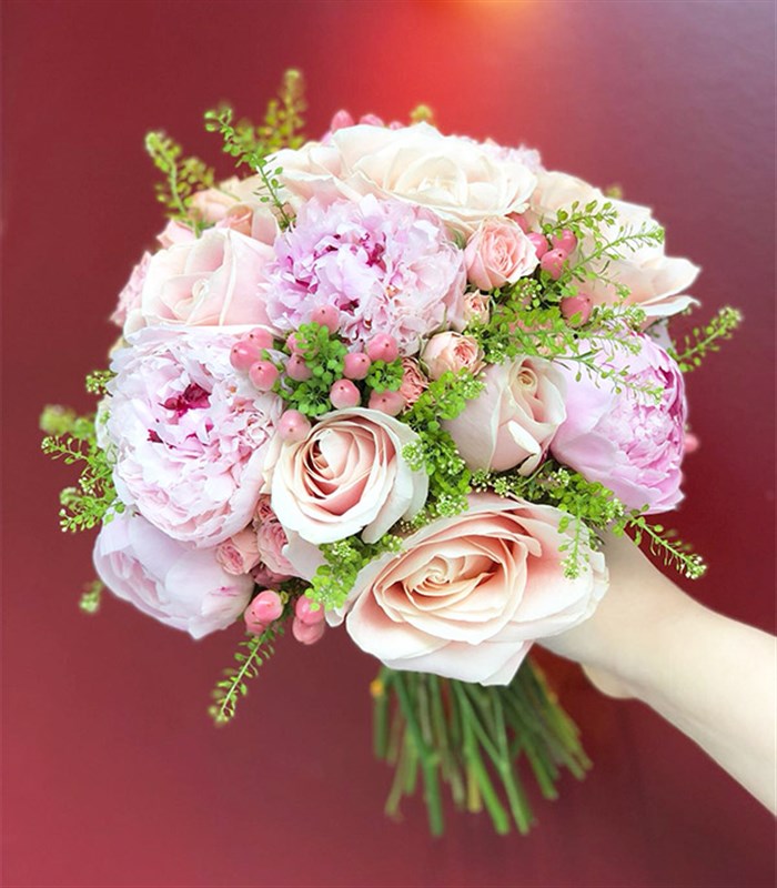 Pespembe tonlarda şakayıklar ve güller ile dizayn ettiğimiz buketimiz, gelinliğinizin en özel dokunuşu olacak.