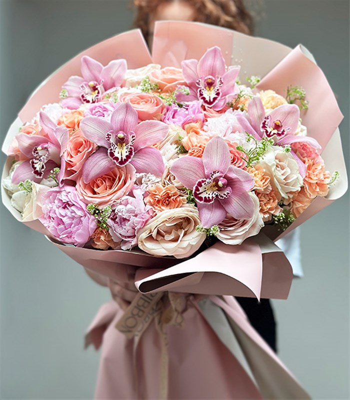 Anneler Günü'ne özel dizayn ettiğimiz buket; somon ve pembe ekvator gülleri, pudra şakayıklar, somon karanfiller, pembe cymbidium orkidelerden oluşmaktadır.