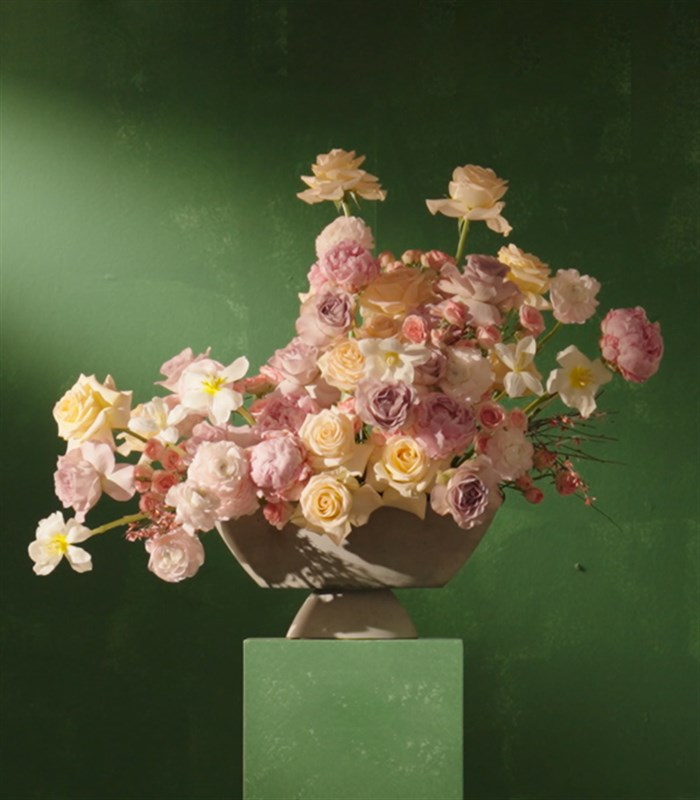 Ayaklı taş beton vazoda; pembe şakayıklar, beyaz laleler, pembe çardak güller, somon güller, lila güller ve pembe erengüller ile dizayn edilmiştir.
