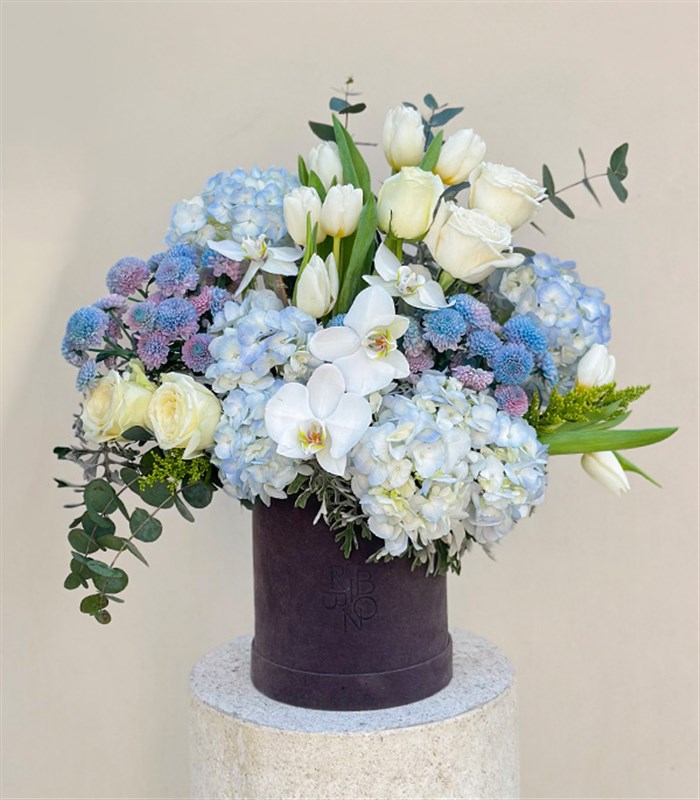 Frost Gri Kutuda Mavi Ortanca Beyaz Laleli Beyaz Çiçekler; Gri kadife kutuda mavi ortancalar, unicorn krizantemler, beyaz laleler, beyaz güller, beyaz orkideler ve mevsime özel yeşillikler ile dizayn edildi.