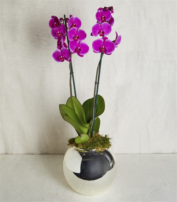 İki dal fuşya phalanopsis orkide gümüş cam yuvarlak vazoda şıklık ve zerafetle buluşuyor.