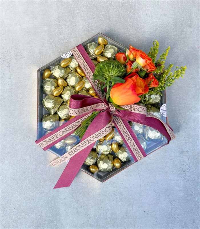 Şık altıgen grand deluxe ayna tepsi içerisinde fındık dolgulu çikolata ve badem drajelerden dizayn edildi.