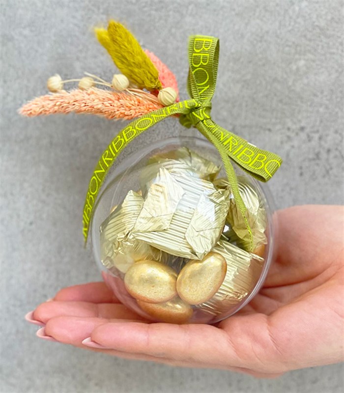 Gold çikolata ve gold drajelerle dolu kuru çiçeklerle kurdele ile dizayn ettiğimiz orta boy küremizi, sepetinize ek ürün olarak ekleyerek sevdiklerinizi çok mutlu edebilirsiniz.