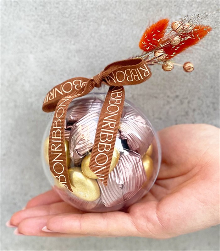 Bronz çikolata ve bronz drajelerle dolu kuru çiçeklerle kurdele ile dizayn ettiğimiz orta boy küremizi, sepetinize ek ürün olarak ekleyerek sevdiklerinizi çok mutlu edebilirsiniz.