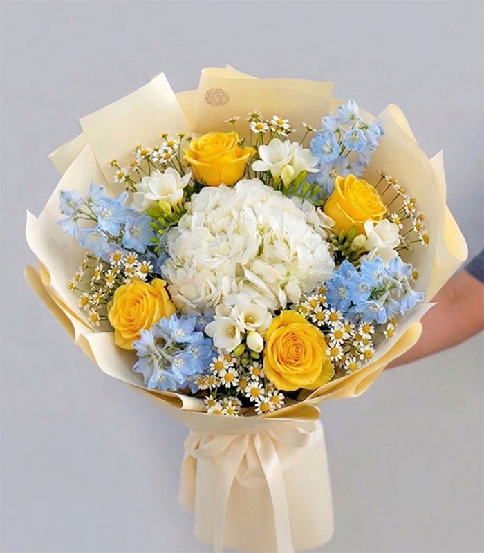 Golden Haze Beyaz Ortanca Sarı Gül Delfinyum Bahar Buketi
